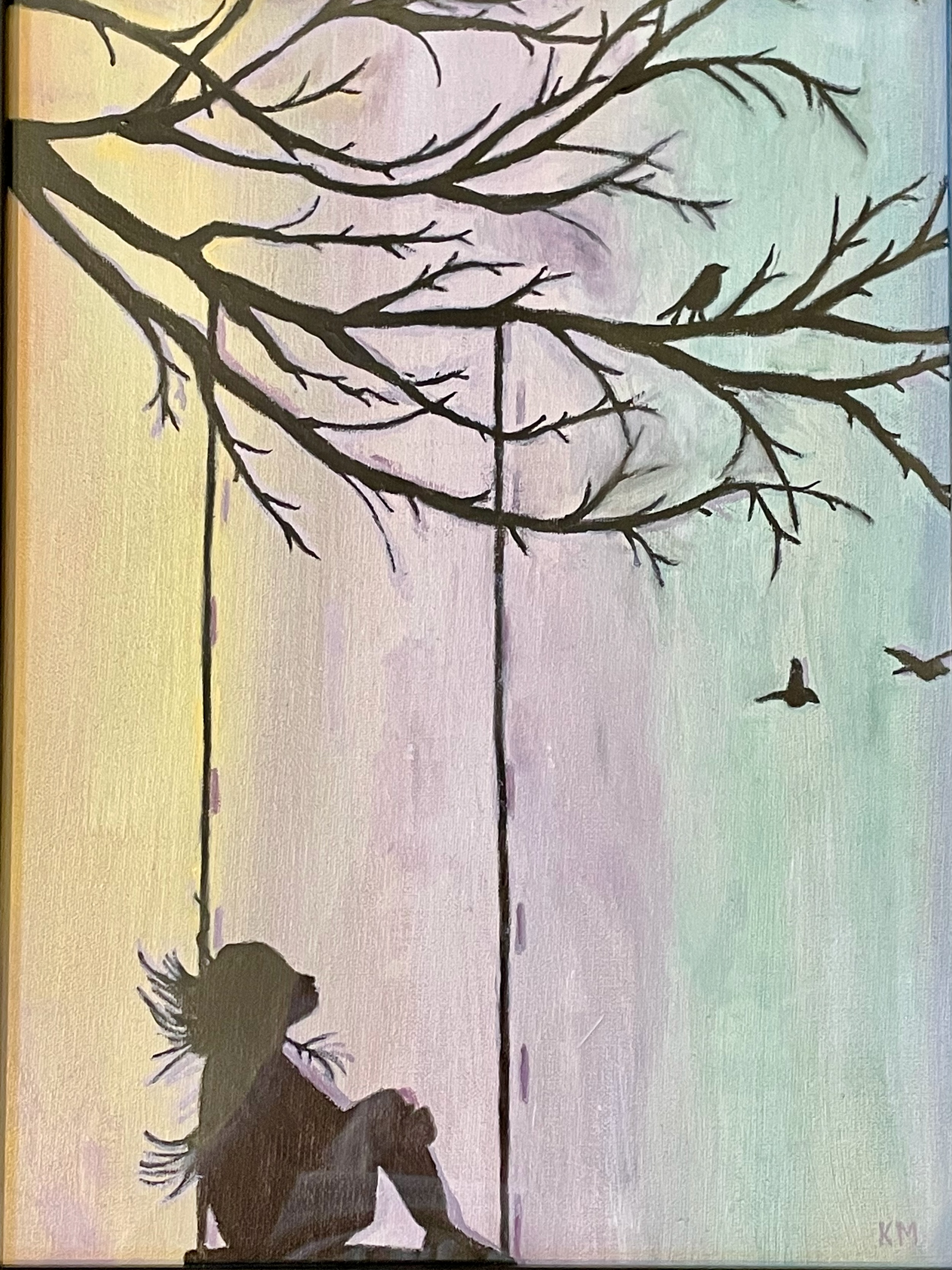 This 9″x12″ oil painting captures a timeless moment of freedom and grace. A young girl—on the edge of becoming a woman—swings gently from a sturdy rope swing tied to a thick, outstretched branch of an old, resilient tree. The tree’s strong branch reaching out like an arm in support, cradles the swing and the girl as if to say, you are safe here. The girl leans back slightly, hair catching the breeze, in quiet joy or reflection. This painting speaks to the beauty of rootedness and motion coexisting—of a girl held by nature, yet free enough to soar within its embrace. It is a tribute to the joy of simple moments, the quiet in-between stages of becoming, and the power of a single swing to carry us into stillness and light.
