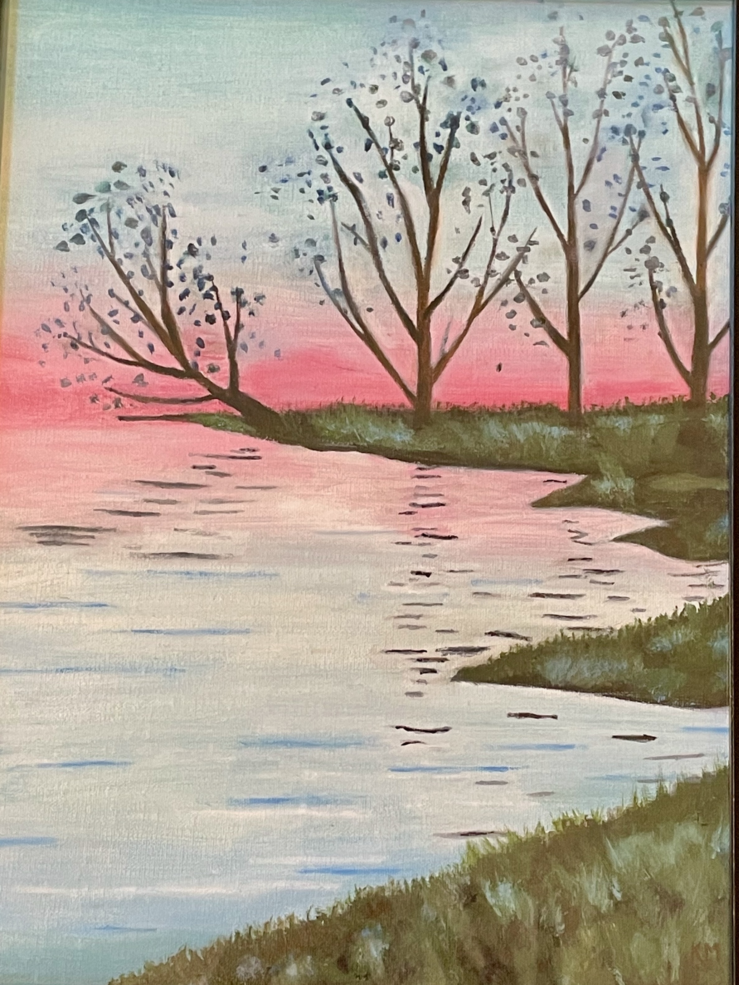 This 9″x12″ oil painting captures a moment of calm—where time seems to pause and nature quietly holds its breath. Four graceful trees stand along the edge of a glassy blue lake. The composition is intentionally uncluttered. The trees stand like sentinels—rooted, silent, and strong—while the lake holds reverence. The overall mood is contemplative, perfect for those who find comfort in solitude and strength in silence. This painting is not just a landscape—it is a reminder that beauty often lives in the quietest places.