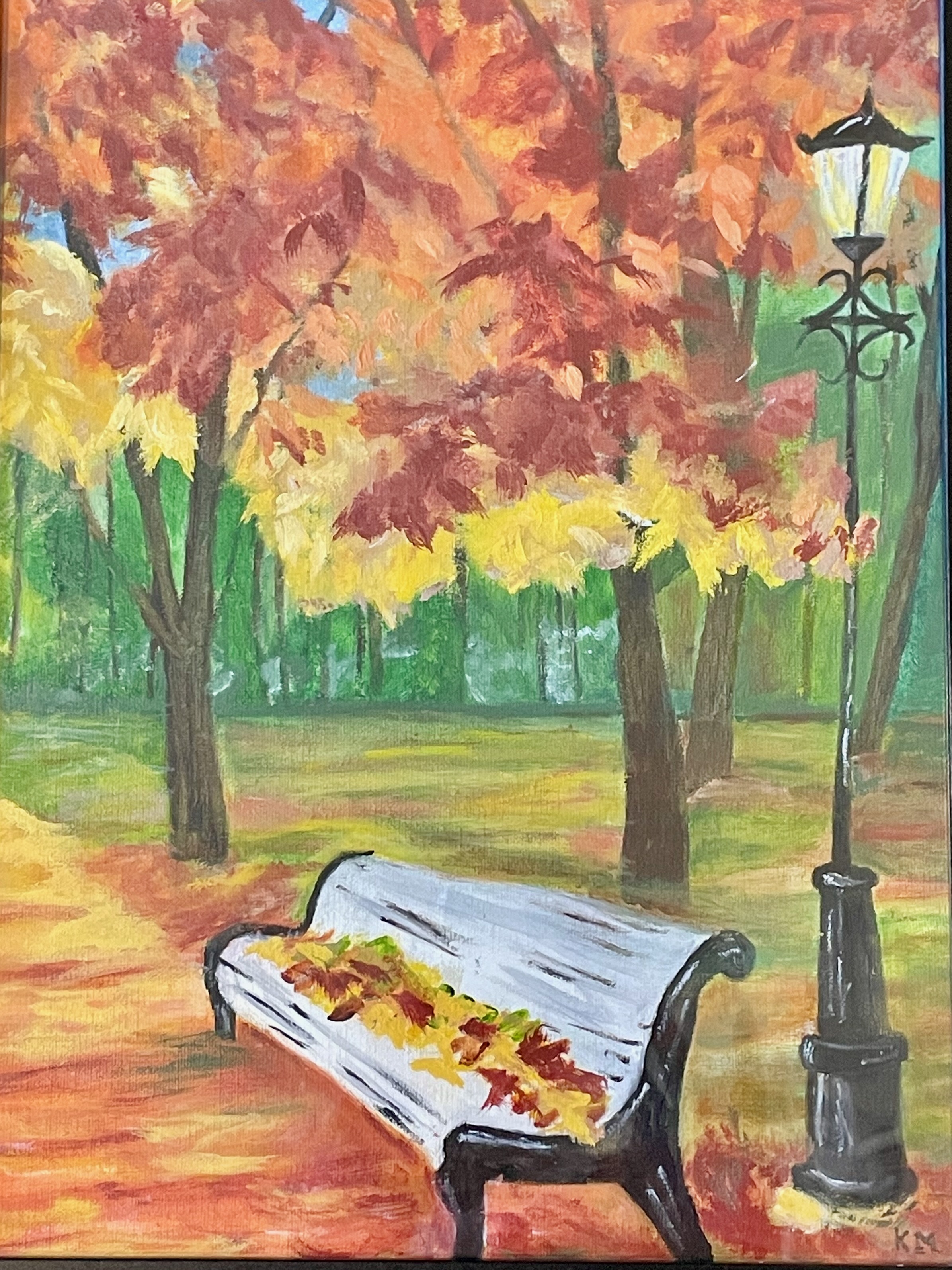 Autumn Pause captures a quiet moment in an autumn park, rendered in warm, richly textured oil paints on a 9″x12″ canvas. The focal point is a simple park bench, slightly off-center, inviting the viewer to sit and take in the peaceful surroundings. Beside the bench stands a tall, black iron lamppost—its soft glow just beginning to flicker on as dusk settles in, adding a nostalgic touch to the scene. The park is bathed in the golden hues of fall. This painting evokes a sense of reflection, solitude, and the quiet beauty found in nature’s transitions. Autumn Pause is a tribute to those fleeting, contemplative moments when we pause, breathe in the crisp air, and simply be.