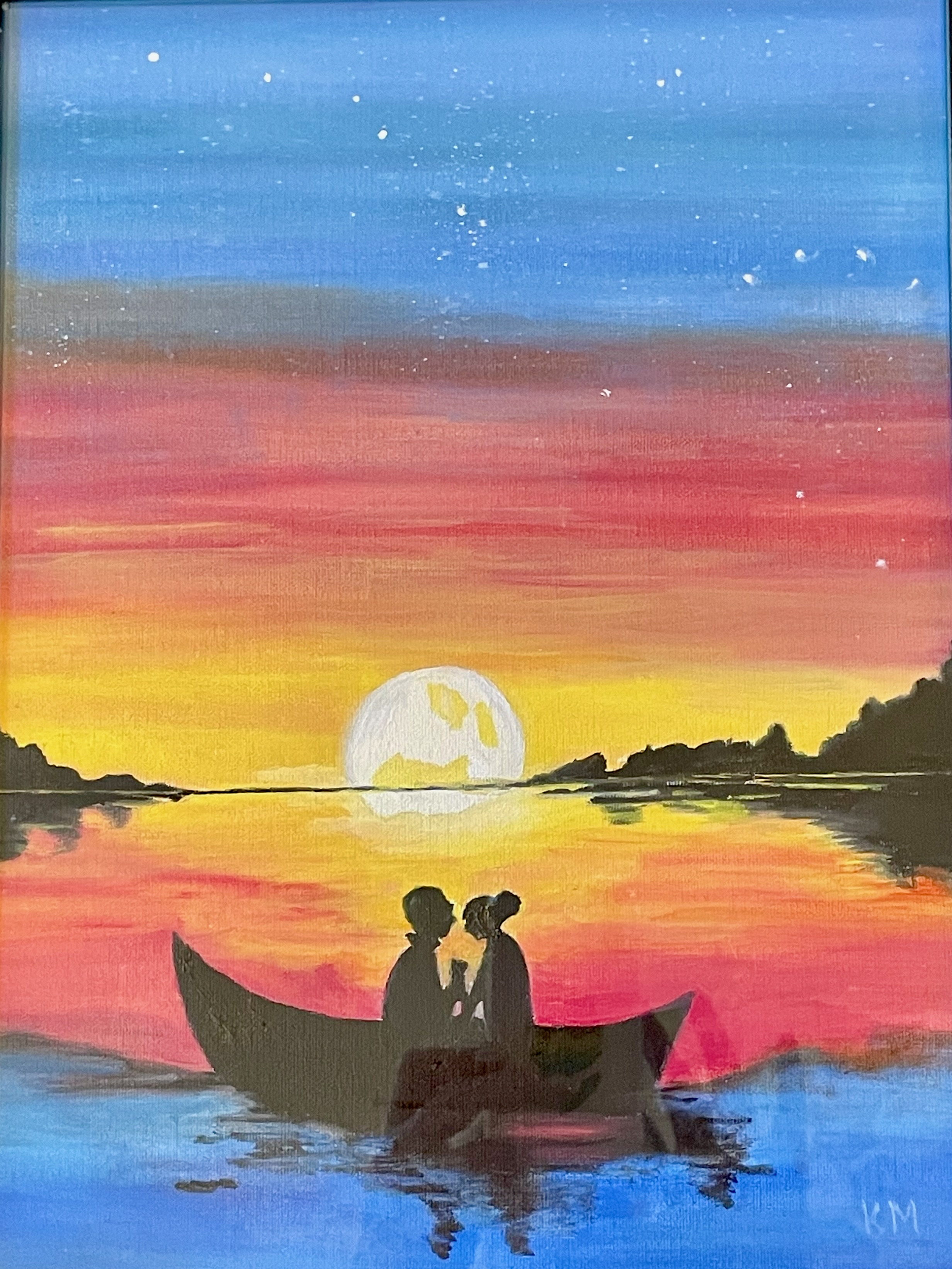 This 9″x12″ oil painting captures a tender, tranquil moment between a couple drifting across a still lake as the day slips into twilight. The canvas is bathed in the warm glow of a setting sun, its golden and rose-colored rays dancing across the water in soft, rippling reflections. Hues of burnt orange, deep coral, and lavender blend seamlessly into the sky, casting a romantic haze over the scene. At the heart of the composition, a small rowboat carries two silhouetted figures—seated closely, yet relaxed—suggesting a quiet intimacy shared without the need for words. Drift Into Dusk invites the viewer to pause, breathe, and remember the beauty of connection—a love that doesn’t need to rush, but simply floats in the quiet magic of the moment.