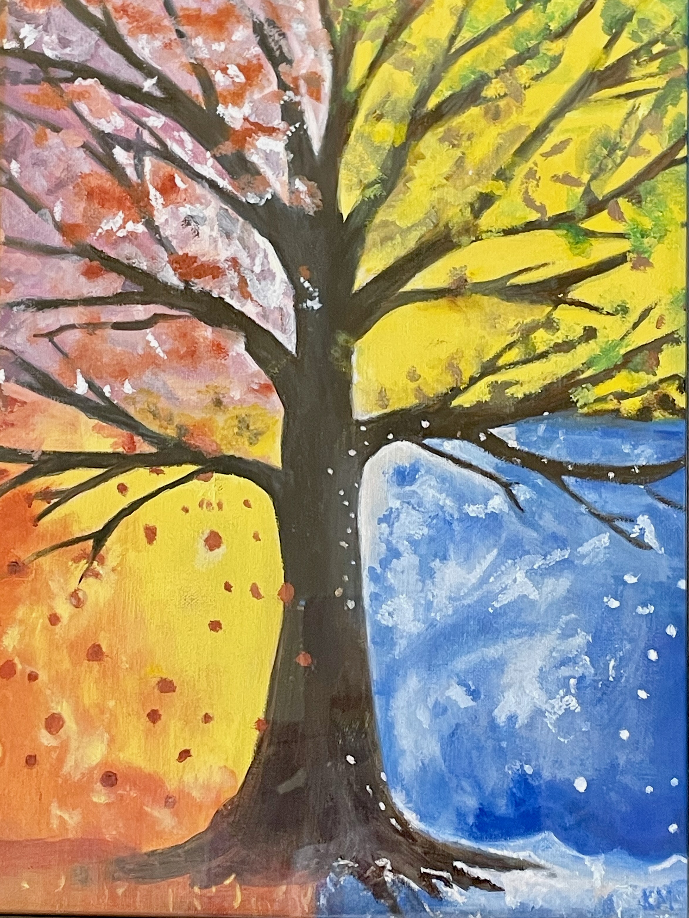 This 9″x12″ oil painting features a single majestic tree, its form elegantly divided into four quadrants—each one portraying a distinct season. Seasons is more than a depiction of nature—it’s a symbolic meditation on life’s evolving chapters. With layered brushwork and textured color, the painting invites viewers to embrace their own seasons, knowing that each carries its own beauty, wisdom, and rhythm.