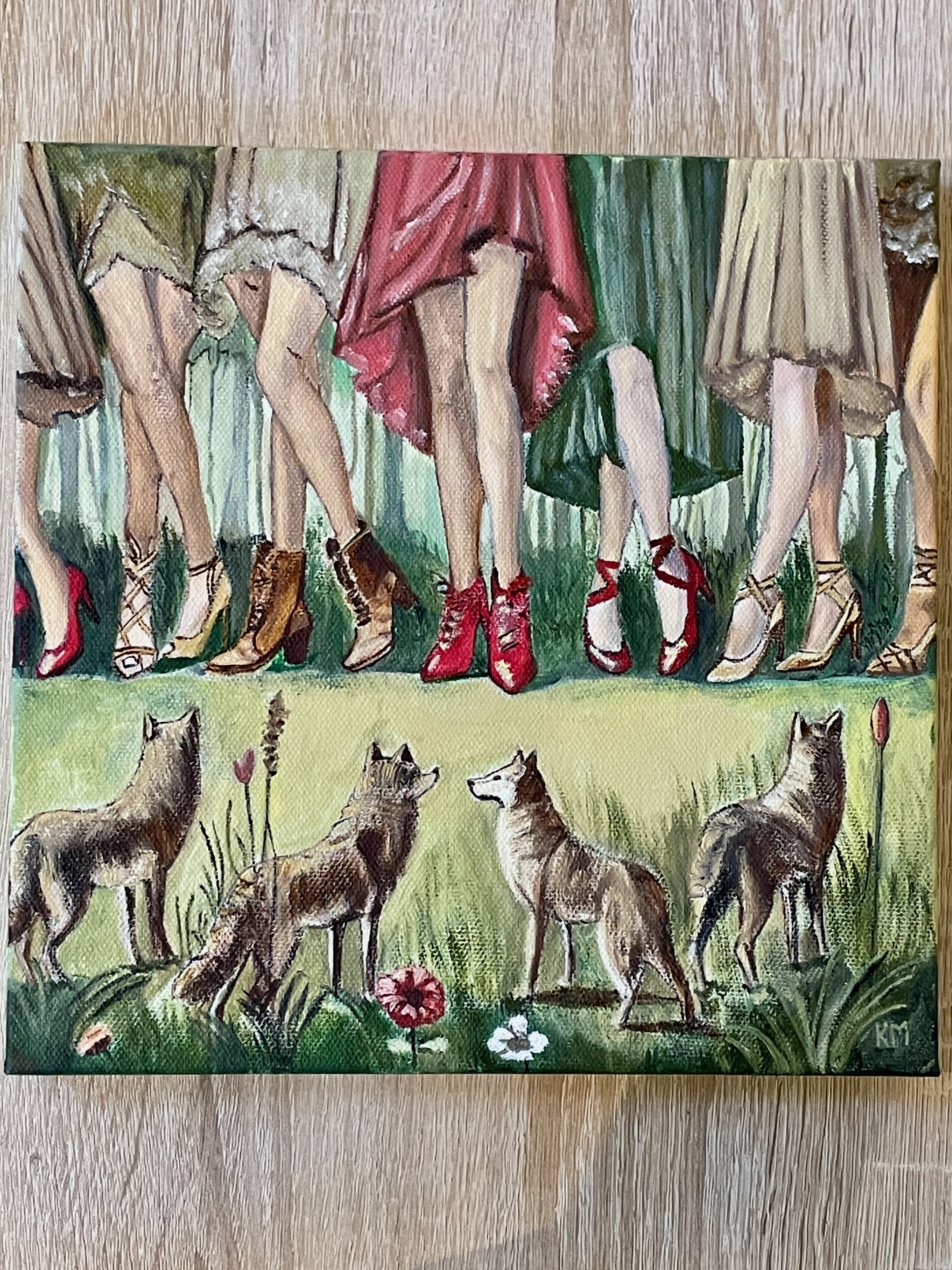 This 10″x10″ oil painting is a bold and evocative visual interpretation of the haunting tale of The Red Shoes, as told in Clarissa Pinkola Estés’ Women Who Run with the Wolves. Rich with symbolism and emotional tension, the composition captures the core message of the chapter: the danger of becoming disconnected from one’s authentic soul-life and the high cost of compulsive, soulless living.