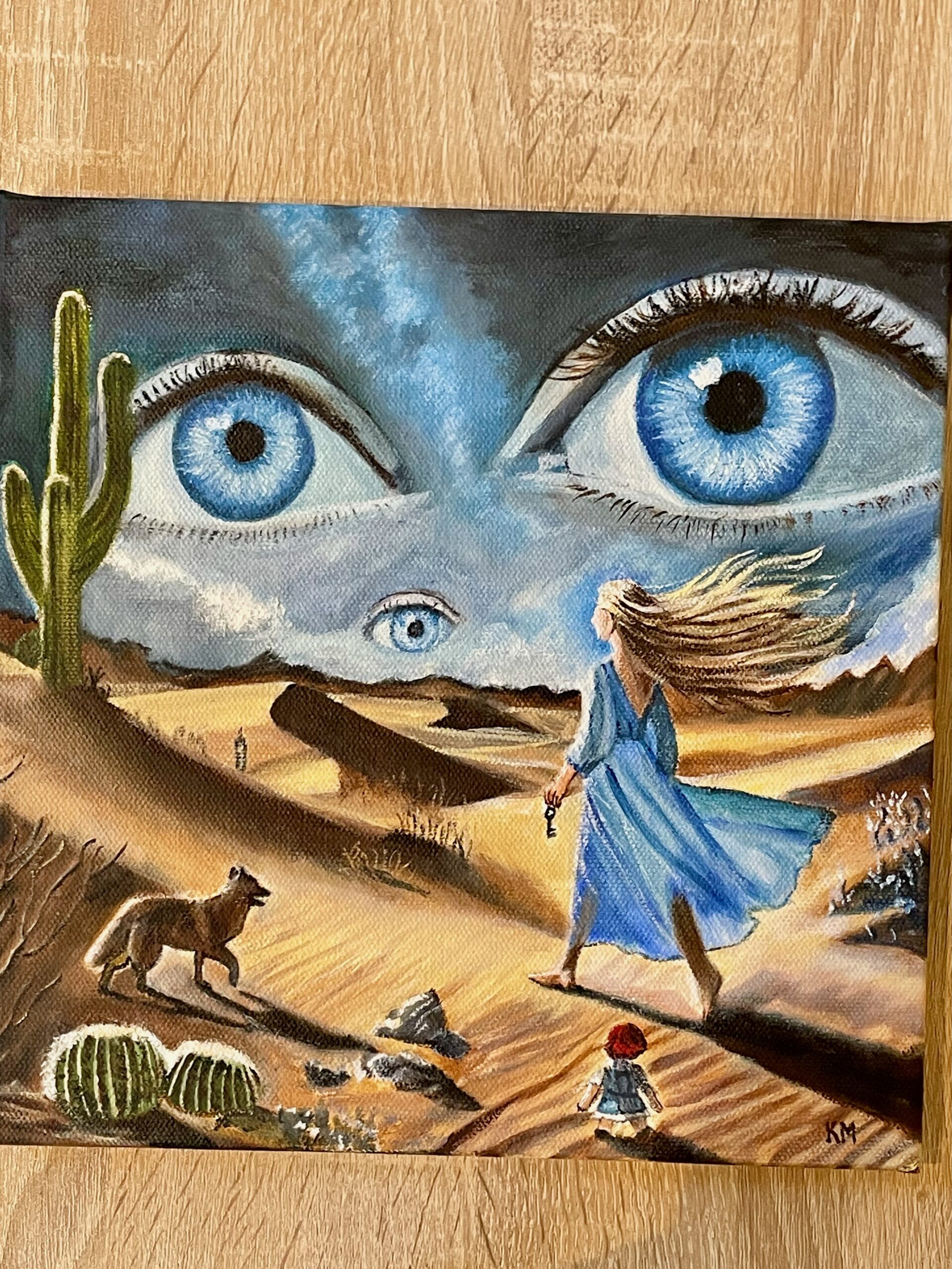 This 10″x10″ oil painting is a symbolic interpretation inspired by Clarissa Pinkola Estés’ seminal work Women Who Run with the Wolves. The canvas captures the wild and instinctual essence of the feminine soul through layered textures and imagery. A lone woman, painted in blue tones walks lightly on desert sand. Her hair flows with the terrain as a she-wolf watches nearby—both protector and mirror.