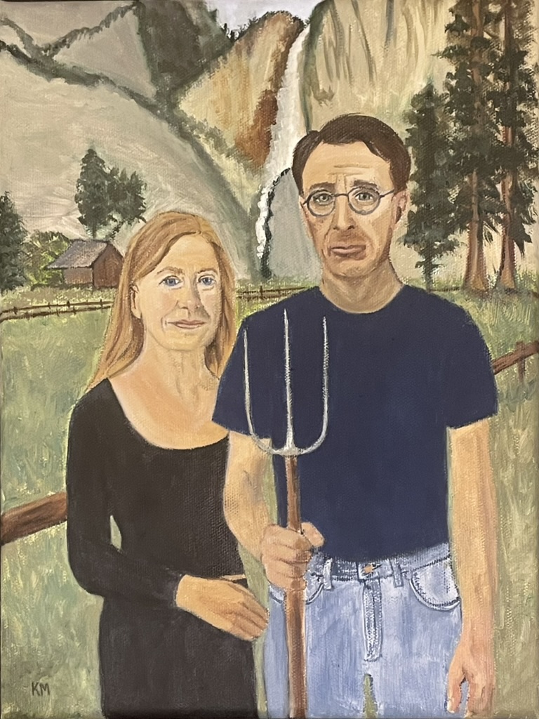 This 9″x12″ oil-painted canvas offers a playful and affectionate twist on the iconic “American Gothic,” featuring the artist and her husband standing in front of the majestic Yosemite Falls. Painted with rich textures and gentle realism, the couple echoes the classic pose—standing side by side, grounded, connected—yet the backdrop transforms the mood entirely. Towering granite cliffs, cascading water, and misty light infuse the scene with grandeur and adventure. The result is a charming blend of tradition and modern sentiment—a portrait that honors both enduring partnership and a shared love of exploration.