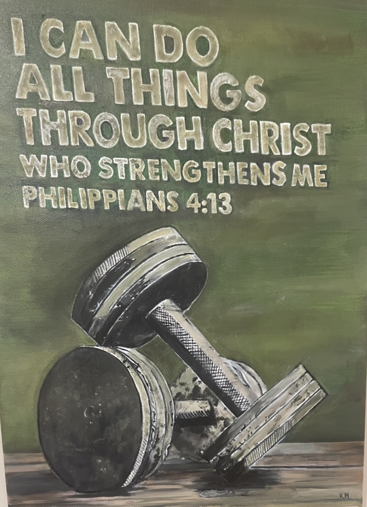 This 12″x16″ oil-painted canvas features a pair of well-worn dumbbells resting on a warm wooden floor, their aged metal catching soft, natural light. Above them, the scripture Philippians 4:13 — “I can do all things through Christ who strengthens me” is hand-painted in a gentle style. The contrast between the rustic weights and the inspiring verse creates a powerful visual message: strength is both physical and spiritual, shaped through perseverance, faith, and daily commitment.