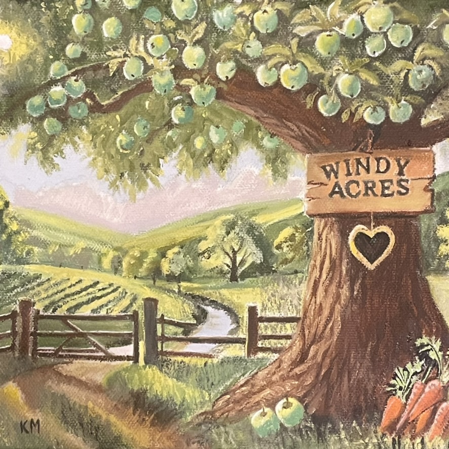 This 8″x8″ oil-painted canvas captures the warm nostalgia of your grandparents’ horse farm, rendered with intimate detail and soft, inviting color. In the foreground, June apple trees stretch their branches toward the viewer, their early fruit and tender leaves adding a sense of seasonal freshness. Just beyond them, a neatly tended vegetable garden hints at the quiet rhythm of daily life—rows of greens, earth tones, and careful cultivation. The farm itself rests peacefully in the background, evoking memories of simpler days, family stories, and the comforting familiarity of a place deeply loved.