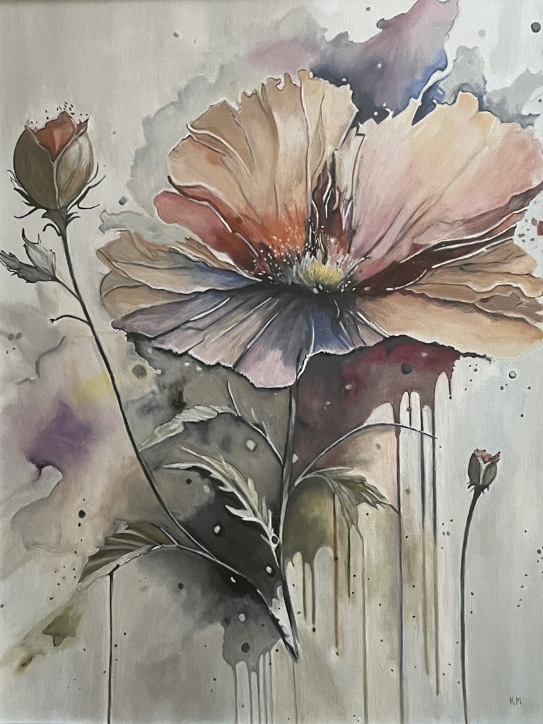 This 22”x28” oil-painted canvas features a striking large poppy as the central focal point, its petals unfolding in rich, vibrant tones. Soft, complementary roses nestle nearby, adding gentle contrast and depth. Subtle drips of paint flow down the canvas, echoing a watercolor-like fluidity and giving the piece an expressive, modern feel. Together, the elements create a blend of bold beauty and delicate movement, inviting the viewer into a moment of vivid, blooming serenity.